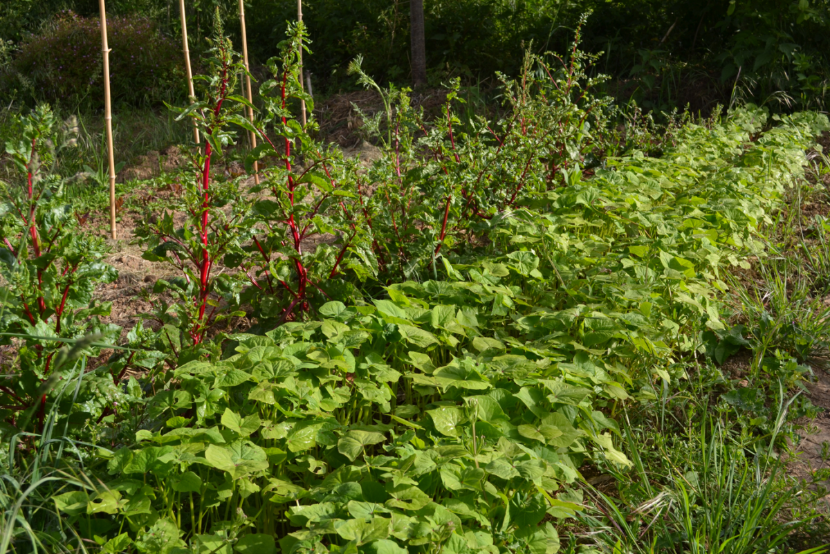 Des sarrasins côtoient des bettes à cardes rouges qui s'apprêtent à fleurir