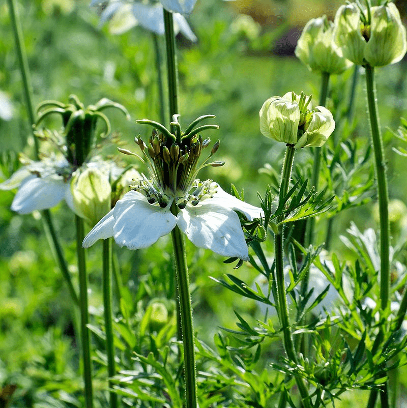 Description : fleur annuelle d’environ 60 cm, très décorative, bleu-clair, blanc ou rose et aux feuilles filiformes. Ses graines ont forte saveur piquante et poivrée. Elle a la réputation de guérir tous les maux. Culture très facile.